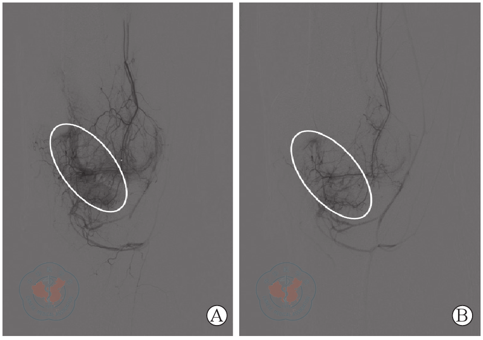 Wang B, Tai TW, Liang KW, et al. Short-term effects of genicular artery embolization on symptoms and bone marrow abnormalities in patients with refractory knee osteoarthritis[J]. J Vasc Interv Radiol, 2023, 34(7): 1126-1134. e2.